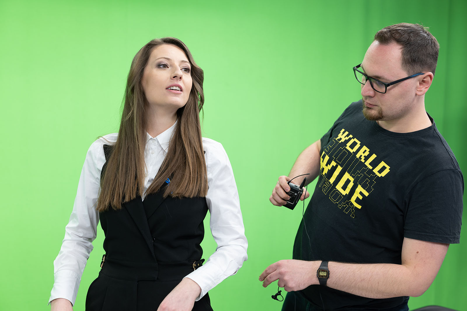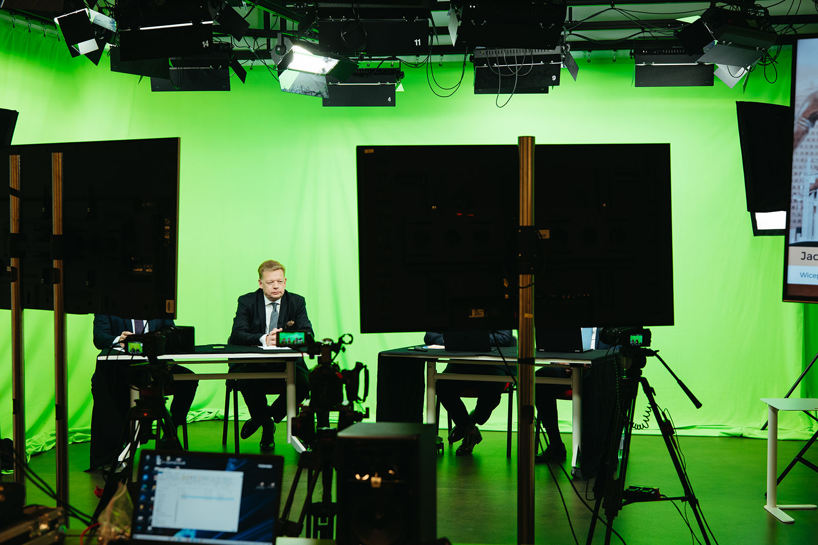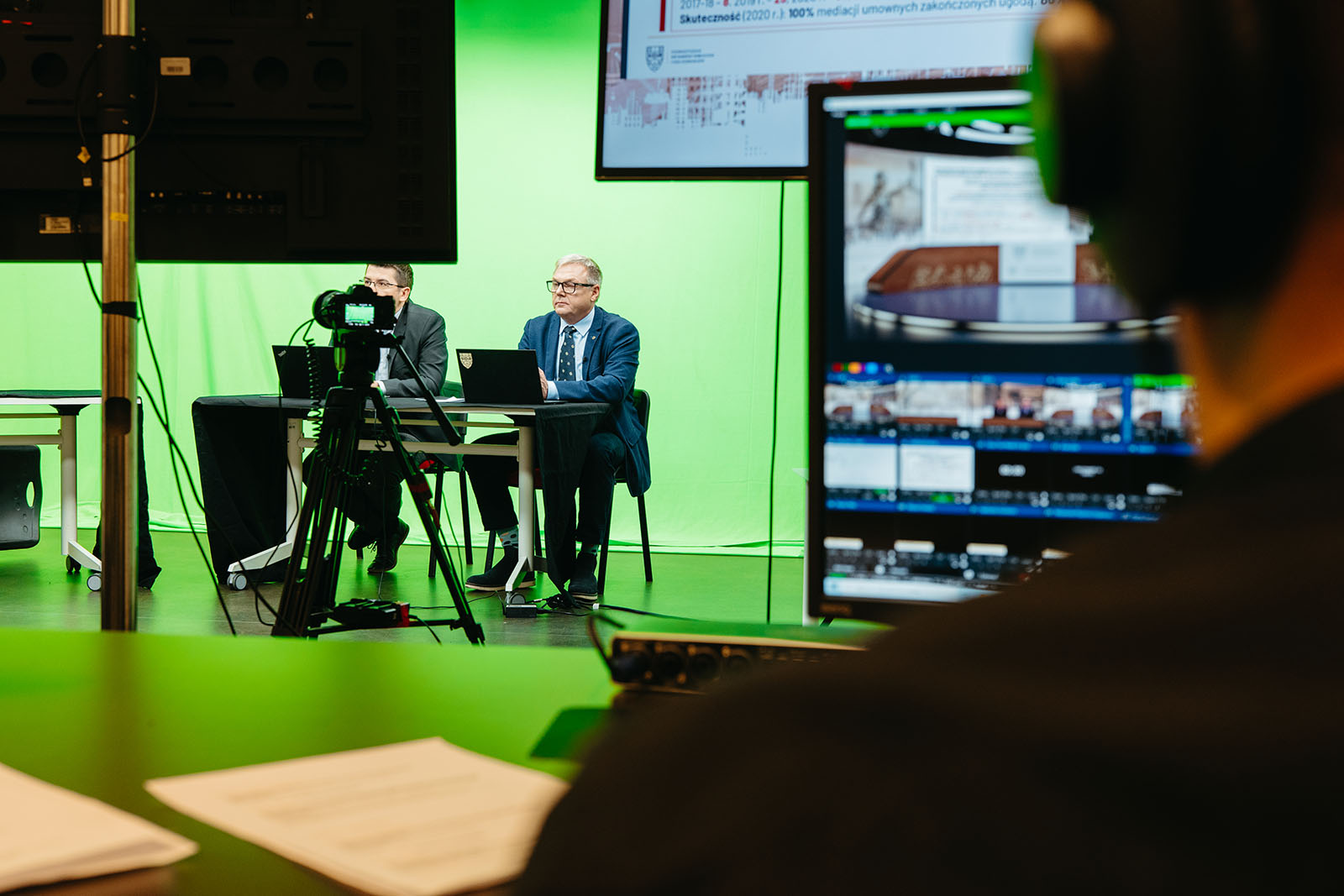 realizacja konferencji online w profesjonalnym green studio zlokalizowanym w Krakowskim Parku Technologicznym. Studio zostało zaprojektowane i przygotowane z pełną oprawą graficzną, w tym intro, identyfikacją wizualną oraz elementami multimedialnymi, co pozwoliło na stworzenie nowoczesnej i atrakcyjnej formy wydarzeń transmitowanych na żywo.